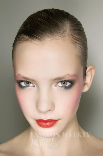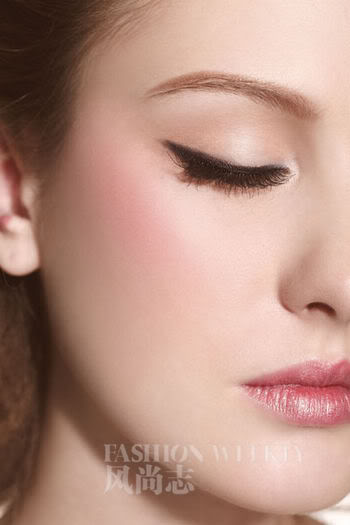 粉紅色的腮紅被雪白的肌膚映襯得更加耀眼,T字區的高光不容忽視,使臉型更加立體。在唇膏的選擇上與腮紅同色系就好。