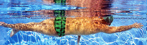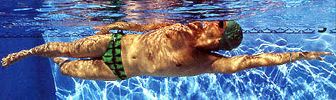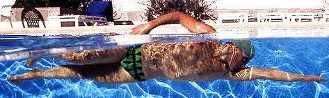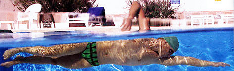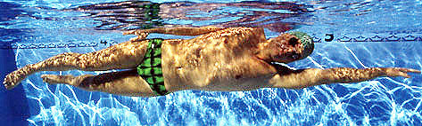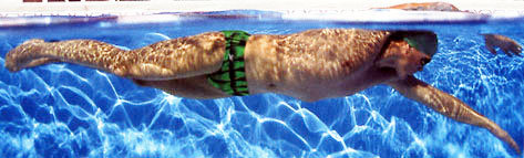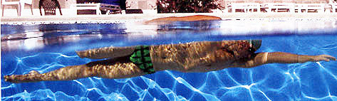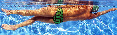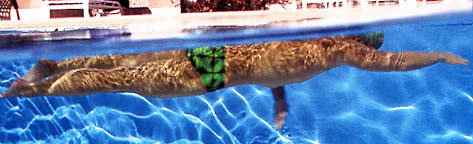 圖3:繼續轉頭直到看見水底,保持平衡。身體仍然是水平伸展,右臂露出水面。注意:頭完全沒於水中。