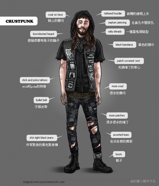 ▲Crust punk(也有人叫做硬殼龐克),由Hardcore punk演變出的一種Punk音樂風格同態度,音樂上比較接近重金屬,而態度就傾向無政府主義。亦有一部份是素食主義者。