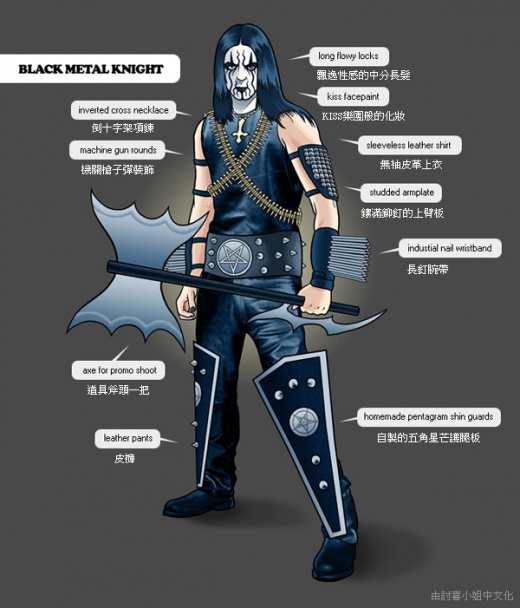 ▲黑色金屬騎士風,是一種極端的重金屬音樂,高度扭曲的吉他顫音、爆炸性節拍擊鼓等等,我想最有名的重金屬明星就是克勞薩大人了吧......詳細資訊在這邊。