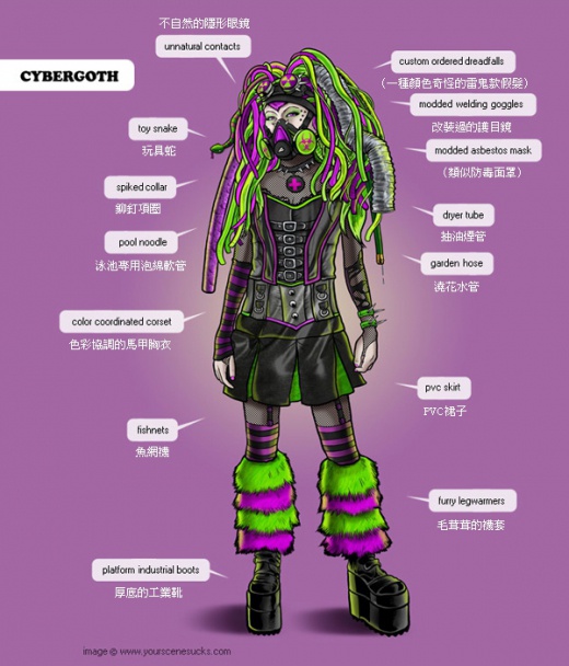 ▲直接翻譯的話叫做「網路歌德」,有點類似角色扮演遊戲的進化版,全身充斥著高科技的塑膠製品,螢光色和黑色的色彩,詳細資訊在這邊。