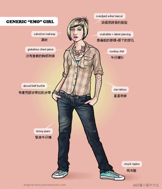 ▲女生版本的EMO,EMO是emocore的簡稱,原本指的是情緒化的硬蕊音樂,歌迷常常會在表演中尖叫、滑跪、情緒失控,而私底下也常常產生負面情緒,後來指某些族群情緒較低落、憂鬱的真偽界線模糊,有的EMO會自殘甚至因為憂鬱的情緒傷害別人。