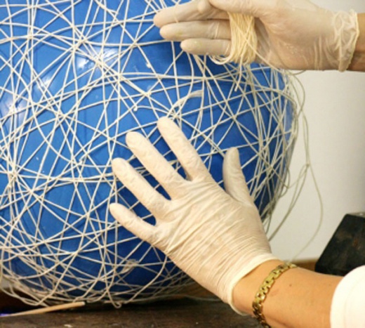 緊接著將棉線上膠後再往氣球上纏繞,你可能會問能不能繞完再上膠,不是不行,但是沒有黏性的棉繩在纏繞過程中容易鬆動,先上膠會比較順手。