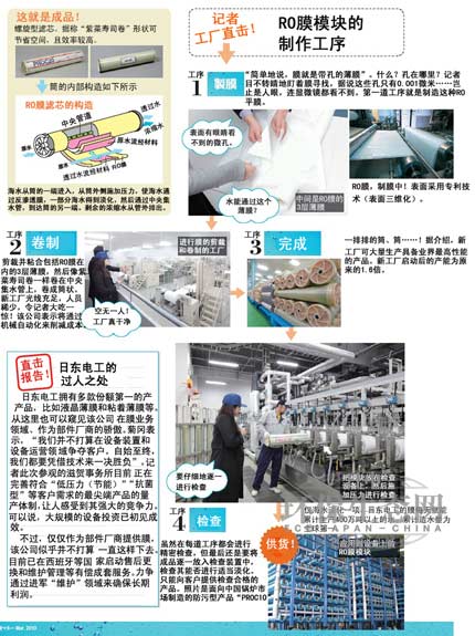 那為什麼日東電工的膜能在全球範圍內得到認可?關鍵還是在於其高性能。膜技術中最重要的是高「阻止率」和高「透水性」。如果為了去除雜質而縮小膜孔,水就很難通過,這樣一來就需要較高的壓力,進而會增加能源成本。而日東電工開發出了可同時實現阻止率及透水性這兩個相反特性的膜技術。使用該技術的海水淡化RO膜「SWC5」獲得了2007年的「日經優秀產品服務獎 最優秀獎」。同年得獎的其他商品還有「Wii」和「凌志」等,由此可以看出該技術的實力。