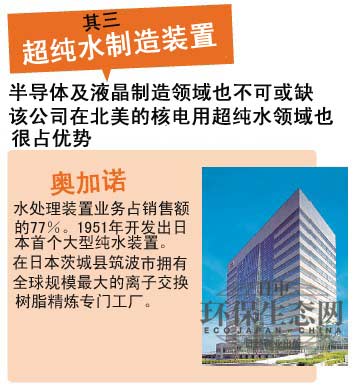 日本奧加諾(ORGANO)公司目前正在生產製造超純水的設備和裝置。要製造純水,需要10~20多道程序,比如使用水處理膜進行過濾、使用離子交換樹脂去除離子等,此外還需要這些程序所需的高端技術。製造裝置的市場規模為每年400億~650億日元左右,日本栗田工業、奧加諾、野村MICRO SCIENCE等3家公司牢牢佔據了9成的市場佔有率。其中,奧加諾的核電用超純水佔據了日本國內市場9成的市場佔有率。據稱該公司今後還將面向北美銷售。