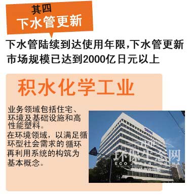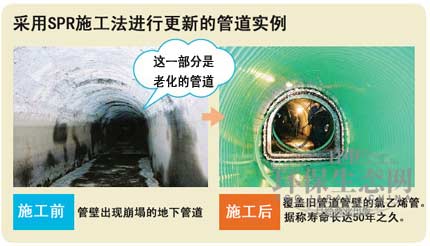 在該領域,日本積水化學工業公司的SPR施工法獲得了日本國內外專利。在老化管道的內側放入氯乙烯再生管,使管道「重獲新生」,與挖開地面取出下水管更換相比,該方法的工期較短,成本也較低。另外還有許多優點,比如可以在不影響污水輸送的情況下施工等。目前,15%的下水管修復工程使用的是這個SPR施工法。尤其是在大城市中較多的大口徑下水管更新方面,該公司在亞洲、美國和歐洲等也具有一定的競爭力。積水化學表示:「目前,僅日本國內的市場規模就達到了2000億日元以上。」(《日經財富》)