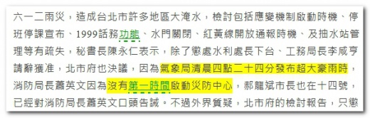 做任何動作前情報是最重要的,莫拉克風災後,政府花了許多預算改善防災資訊系統,但因為官員們的怠惰,明明可以做到事先預防提前反映卻紋風不動。 路塌了,土石流破壞房產,沒有事先疏散人民。應該要移的車子泡水了,清晨學生出門前的七點應該宣佈停止上班上課卻延到十點。要開的水閘門沒有開,要堆的沙包沒有堆,要開的抽水機沒有開,該停駛的路口和斷橋前沒有警察。