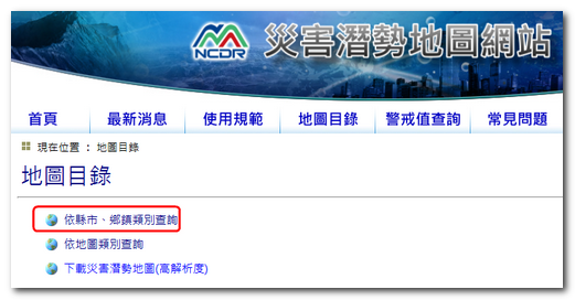 點選依縣市、鄉鎮類別查詢,再依不同行政區選擇,就可以得到各地的淹水潛勢地圖和坡地災害潛勢地圖。