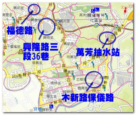 以文山區為例,6月12日的超大豪雨,累積雨量超過350毫米。這次在新聞報導中出現的淹水地點,事實上都早已標示在淹水潛勢地圖的警告點上 (灰色地區):