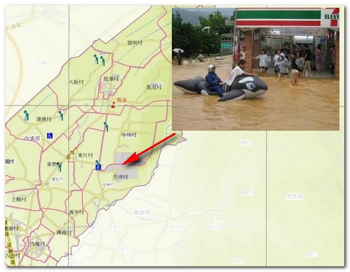 24小時累積雨量超過300毫米,這隻殺人鯨便會出現在屏科大門口的7-11旁。