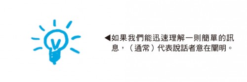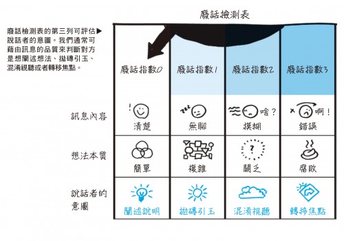 我們可以利用廢話檢測儀的第三列來比對說話者的動機以及訊息內容的清晰程度,藉此推敲他的意圖。舉例來說,第一格指數顯示的是說話者發表了一則簡單的訊息,讓我們能快速理解,如此一來,就能假設他的目的在某個程度上是要「闡明」一項想法。
