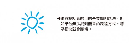 本書還有第三個根本前提,那就是我們不需要廢話來傳達訊息。無論想要說什麼—簡單也好複雜也好、安慰也好恫嚇也好、幻想也好實際也好、讚美也好批評也好—任何想法我們都能表達得清楚明瞭、引人入勝,不管是對聽眾或我們自己。