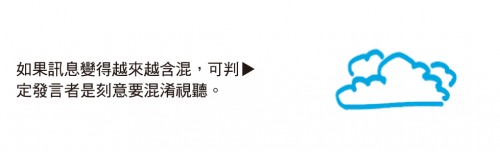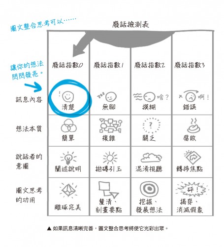 揭發說話者苦心隱瞞的意圖。這就是圖文思考中圖像的功能,它比任何文字都要有效。我們無法僅憑一己之力戰勝「三級廢話」,必須召集所有相關人士—說話者、