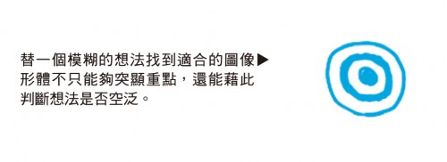 在之後的章節中,我們將用廢話檢測儀來說明使用圖文思考的場合、時機和方法,學習該如何整合語文和圖像心智,讓它們發揮最大功效。而要思考文字和圖像最簡單的方法就是: