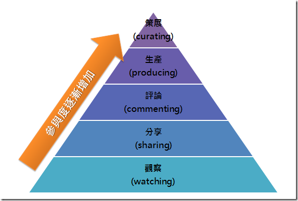 導》這本書中提到的參與金字塔來描述,他將社交網路中的互動分成五個等級,有興趣的朋友可以自己去翻翻看。