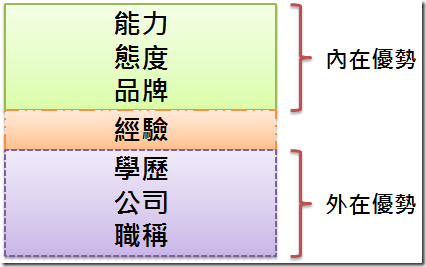 我們都很容易因為一個人的特殊經歷、職稱、公司而對他有特別的興趣,而在我自己身上,我也曾因為我的學歷而被大家稱為好學生,也曾因為我的職稱而被說是年輕有為,但我今天要跟大家分享的就是,不管是學歷、職稱、經歷,這些都是外在優勢,一旦拿掉,你可能什麼都沒有了,為什麼這樣說呢?因為這些東西你擁有的時間都有上限,你總有一天必須要離開它,這些帶不走的東西,我稱之為「外在優勢」,而什麼叫「內在優勢」呢?就是那些你帶的走的東西,包含你的能力、態度、品牌,以及你歷練且學習到的「有用經驗」,我指的有用經驗是你不是單單在一家公司待過,你是在這家公司中學習到有用的知識;你也不是單單做過某個職務,而是在職務期間,你學習到能帶到下一份工作的經驗,我以下面這張圖來說明內、外在優勢。