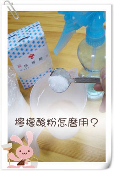 檸檬酸粉為粗顆粒狀,因此會建議要先以十倍溫水溶化後 再倒入噴瓶內使用較不會造成堵塞。