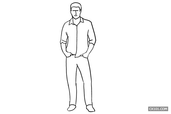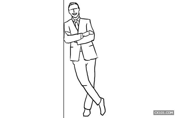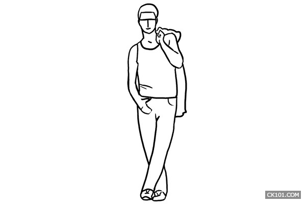 ▼瀟灑形︰搭著外套,然後只插姆指進口袋,腳也繞著,是一種綜合了的姿勢。