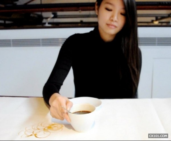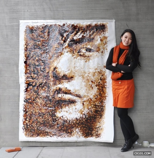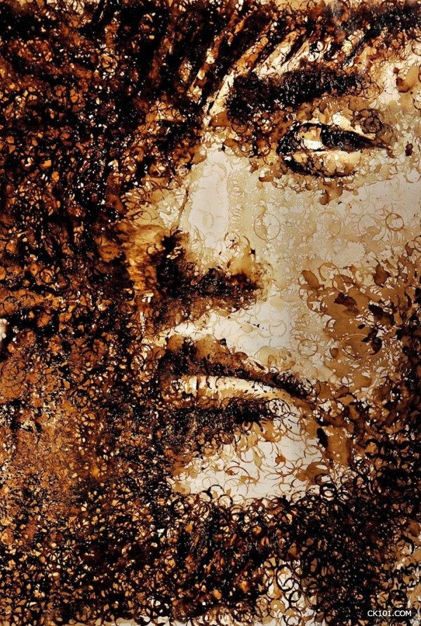 是的,咖啡。人們必之唯恐不及的咖啡印漬,經過藝術家的巧手也能化身成別緻的畫作。這張細節毫不馬虎的周杰倫肖像畫的靈感出自歌曲和電影「不能說的秘密」。還記得嗎?就是歌詞中的第一句冷咖啡離開了杯墊造就這幅畫作。