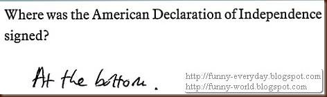 Q: 美國獨立宣言是在哪簽的? A: 考卷下方。(可能美國考卷下方都有一些宣言吧)