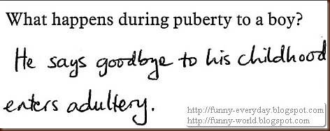 青春期男孩的那一則,好笑是在於。。。 本來應該是寫 adulthood 成年, 可是答案卻寫成 adultery 通姦! | |