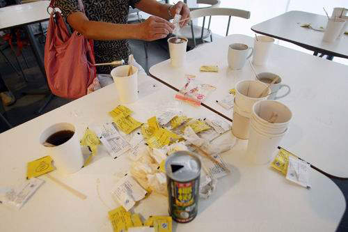 也因為他們佔據了餐廳的位置,不少購物的客人不但無法利用,因為他們在這裡的時間長,相對咖啡、紙杯等等的消耗量更是假日的三倍呢!