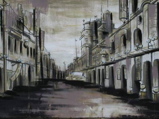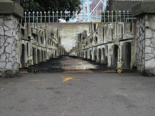 幾天前去高雄市文化中心看場表演,徒步經過五福路時發現這家主人非常有創意。在兩座門柱間的鐵門上畫上了這幅彩畫與兩旁的門柱形成有趣畫面。