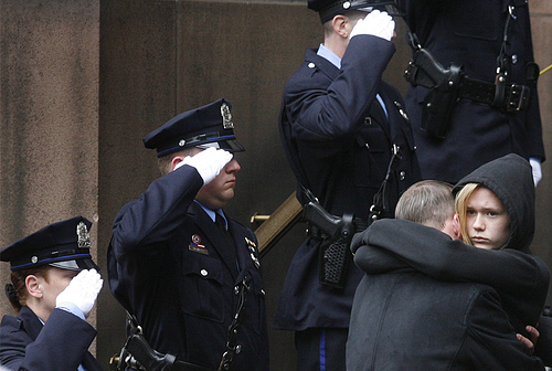 15.May 9, 2008. 費城警官 Stephen Liczbinski 的子女在他的葬禮上擁抱 . 警官 Liczbinski 在當月 3 日的一起銀行搶劫中被射殺