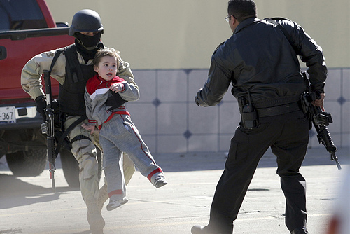 16.January 17, 2008. 墨西哥蒂華納的一次清剿毒品黑幫行動中警方幫助學校疏散