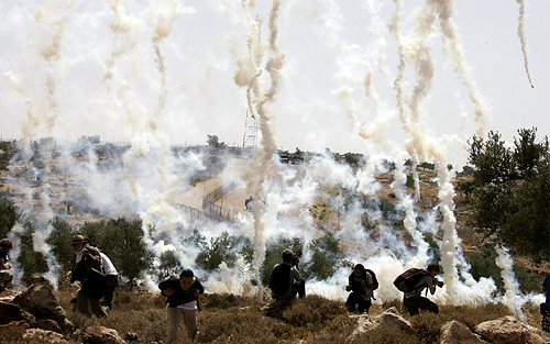22.June 6, 2008. 在抗議建造隔離牆的活動中 , 以軍士兵發射的催淚瓦斯罐落入抗議者人群