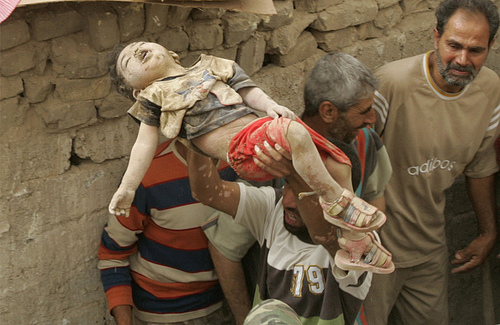 38.April 29, 2008.一名男子在巴格達薩德爾城空襲後把一個兒童的屍體運出毀壞的房屋