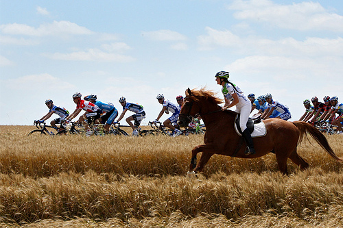 6.July 9, 2008. 一個女性在法國沙托魯與環法自行車賽手並行奔馳