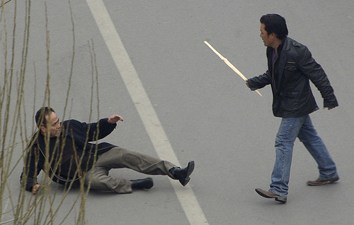 7.March 14, 2008. 一個藏人準備用棍棒攻擊倒在地上的漢人