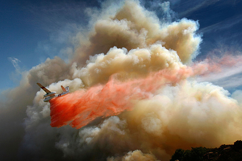 9.July 3, 2008. 一架救火飛機投放阻燃劑分割山火 . 加州中北部有大約 680平方英里遭火災