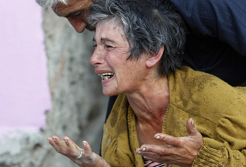 15.August 11, 2008. 一名格魯吉亞女子被丈夫安慰 , 她的孩子在格魯吉亞第比利斯附近的格裡周邊村莊被殺