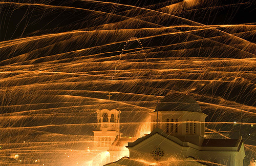 25.April 26, 2008. 希臘東愛琴海島嶼希俄斯 . 在希臘東正教復活節慶祝活動中火箭飛越聖馬可教堂鐘樓 . 敵對的教區每年復活節互相對對方教堂鐘樓發射數千發火箭是百年歷史的傳統