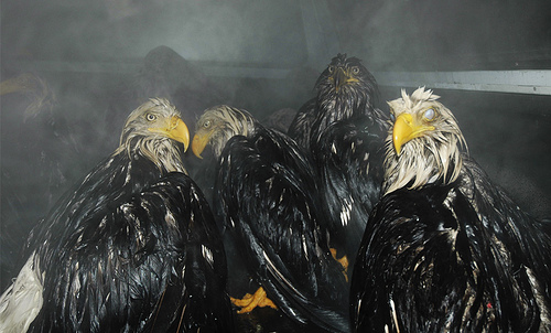 39.Jan. 11, 2008. 鷹群等待被轉移到美國魚類和野生動物倉庫 . 大約 50 只鷹進入了運送魚類的卡車飽食但是潮濕羽毛難以飛走直到從阿拉斯加的科迪亞可被救出