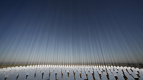 2.November 6, 2008. 西班牙塞維利亞的 "solucar" 太陽能公園 , 太陽能熱電站採用反射鏡集中太陽光到 100 米塔 , 那裡產生蒸汽驅動渦輪發電