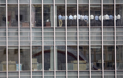6.September 11, 2008. 倫敦金絲雀碼頭金融區 , 工作人員站在雷曼兄弟公司辦事處的會議室裡 . 雷曼成為美國歷史上最大的破產案
