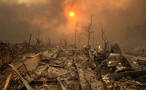 11.November 15, 2008. 洛杉磯 Sylmar 郡 600-800 移動房屋被燒毀 , 昨夜開始的山火焚燒了 10.5 平方公里 , 由於每小時 70 英里的無定向風 , 消防飛機到早上仍無法起飛