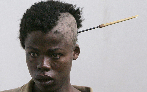 21.January 26, 2008. 肯尼亞大裂谷區那庫魯鎮的種族衝突之後 , 一個年輕人頭上帶著箭頭前往醫院