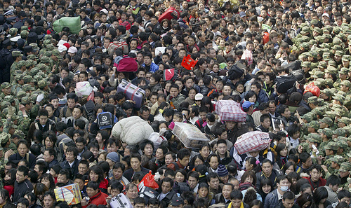 25.February 3, 2008. 士兵在廣州火車站維持秩序 , 因冰雪而取消了幾日的車次 , 沮喪擁擠的滯留乘客造成一人踩踏死亡