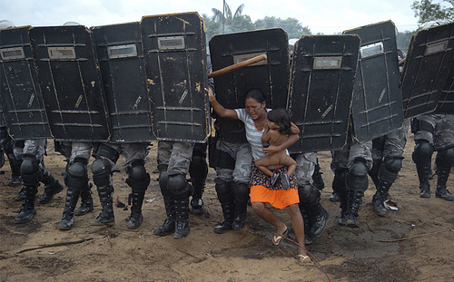 26.March 11, 2008. 一名土著女子帶著孩子試圖抵抗亞馬遜州警察 , 她和大約 200居民因土地私有化被強行遷出 . 失去土地的農民使用弓箭對抗擁有催淚瓦斯和警犬的警察 , 最終被逐出土地