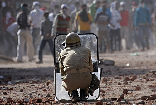 33.September 9, 2008. 一名印度警察使用盾牆防禦克什米爾穆斯林抗議者的遠程投擲