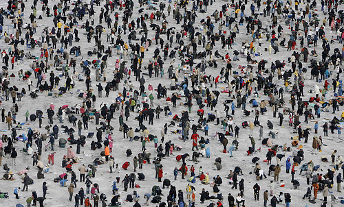 34.January 13, 2008.年度冰節裡 , 非軍事區以南韓國人在冰河上用線垂入水中釣鱒魚
