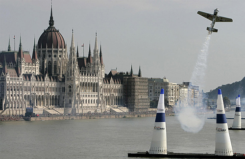 37.August 20, 2008. 匈牙利布達佩斯議會大廈前 , 奧地利飛行員 Hannes Arch在紅牛空中系列賽中完成動作