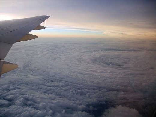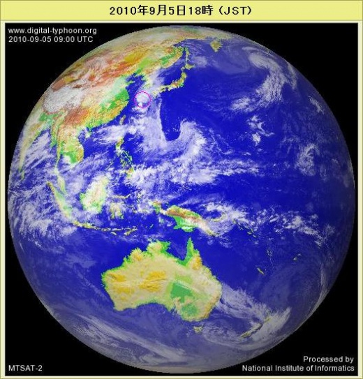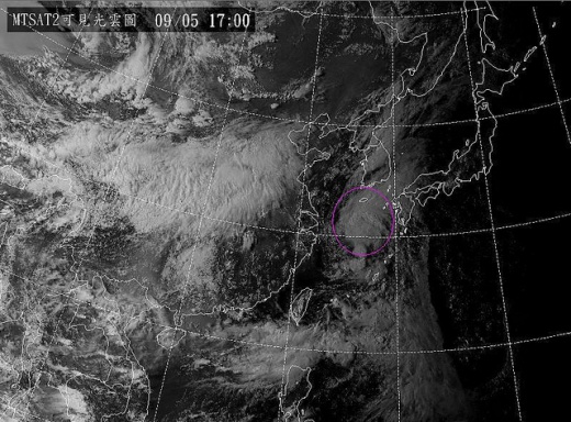 話說台灣時間9月5日下午5點50分左右,我正坐在泰國航空TG635從首爾飛回台灣的飛機上無奈的大啖難吃的晚餐,忽聞機長廣播,大意是說我們正飛越西北太平洋上編號第09號的輕度颱風上空,坐在右側窗邊乘客可以欣賞這難得一見的大自然奇觀。