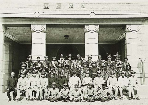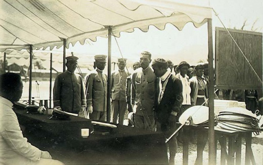 此為塔瑪荷社原住民的歸順典禮進行畫面,攝於西元1933年(昭和8年),原住民列左一為頭目拉荷˙阿雷。