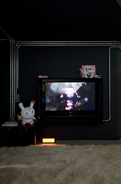 這一間應該是女生房間,同樣地管線裸露,灰色的水泥牆,灰白色的床舖設計,其他的傢俱則有了女孩的氣息,呈現在低調中的活力奔放,與原始中的現代元素。