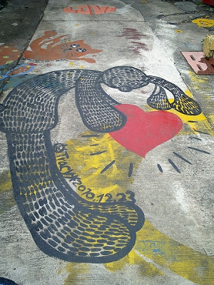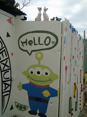 目前自助新村的彩繪創作,由五名海青工商廣告科學生接手,他們每天下課後到此彩繪,期待能有佳音,「就算不幸被拆,它也活在民眾的回憶裡!」